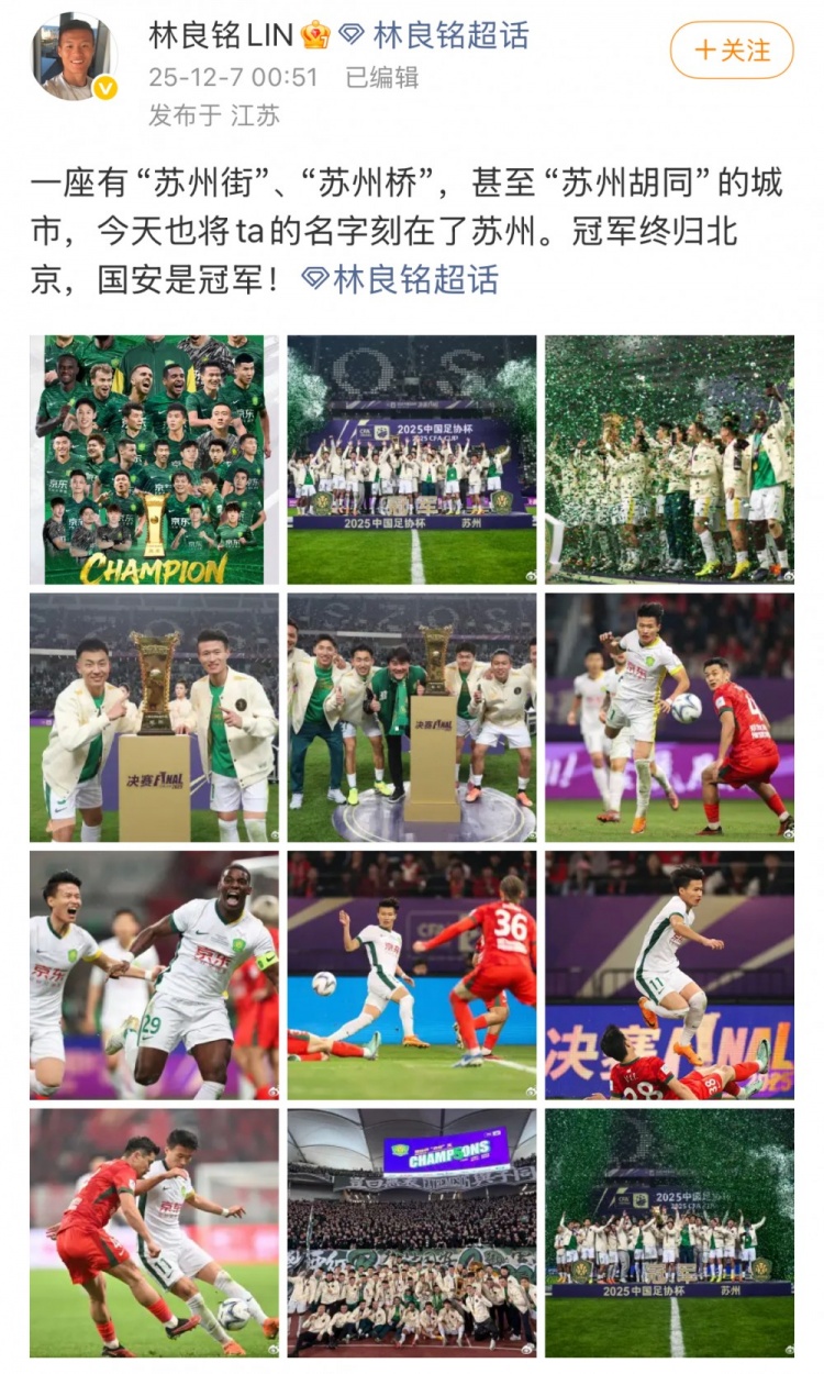 足球比分网12月7日讯 2025赛季足协杯决赛于昨晚落下帷幕,最终北京国安3-0击败河南队,队史第5次捧得足协杯冠军。 赛后国安中场林良铭更新社媒,晒出多张赛场照和庆祝照等,并配文...