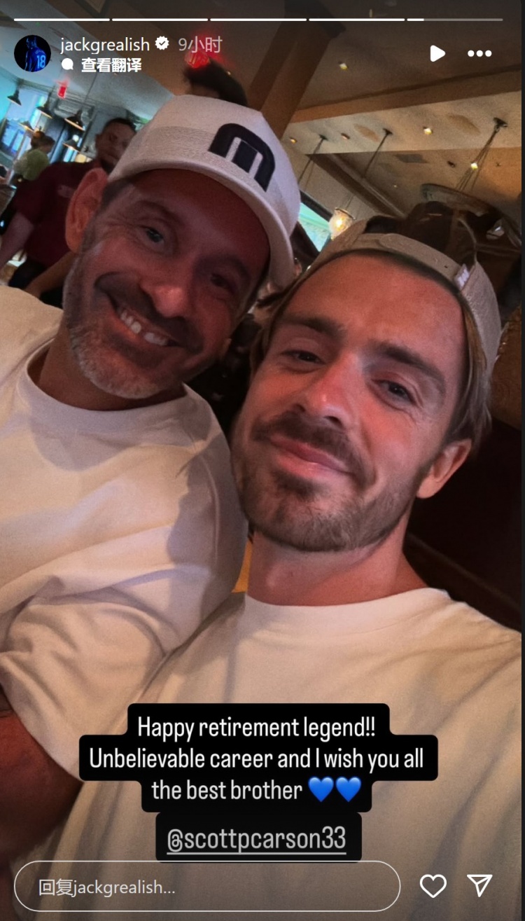 足球比分网10月24日讯 40岁前曼城门将卡森宣布退役,格拉利什社媒送上祝福。 格拉利什社媒晒出与卡森的合照,配文:“退役快乐,传奇!” “不可思议的职业生涯,我祝你一切顺利...