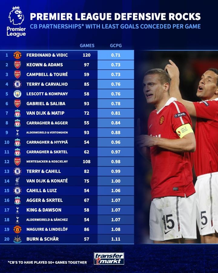 足球比分网10月24日讯 《转会市场网》统计了英超历史场均丢球数最少的20组中后卫搭档,该榜单只统计合作了50场以上的中后卫搭档。 1.费迪南德、维迪奇(曼联):搭档120场,场均丢...