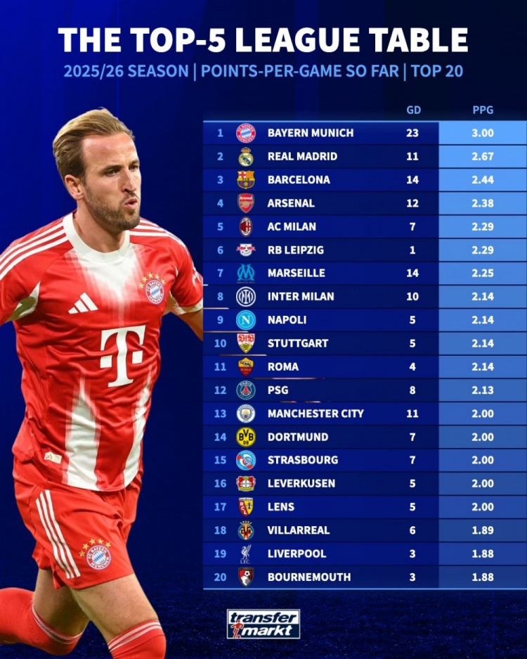 足球比分网10月25日讯 《转会市场》统计了本赛季五大联赛球队的场均拿分情况,拜仁、皇马、巴萨、阿森纳分列前四。 本赛季五大联赛场均拿分榜(及净胜球数): 1.拜仁慕尼黑,23球...