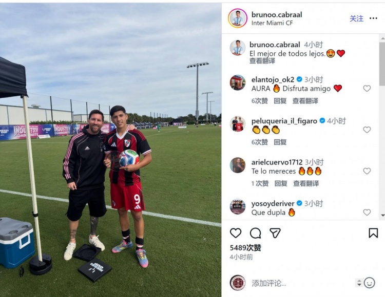 足球比分网12月12日讯 河床青训小将布鲁诺·卡布拉尔更新社媒动态,晒出与梅西的合照。 15岁的布鲁诺·卡布拉尔在河床对阵国米的梅西杯比赛中戴帽,他当选全场最佳球员,带走比赛...
