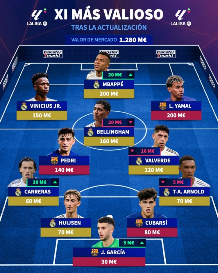 足球比分网12月12日讯 德国转会市场更新了西甲球员的身价,并列出西甲身价最高阵容,姆巴佩、亚马尔、维尼修斯、贝林厄姆、佩德里在列。 西甲身价最高阵容(总价12.8亿欧): 门...