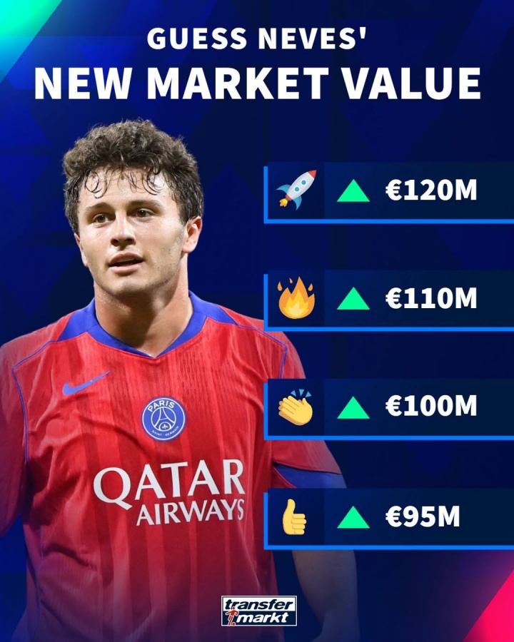 足球比分网12月13日讯德转更新社媒,预热了巴黎中场若昂·内维斯的身价变动。 内维斯现在的身价为9000万欧,德转预热的四个价格分别为9500万欧,1亿欧,1.1亿欧和1.2亿欧。 内维斯现...