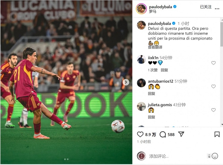 足球比分网10月24日讯 欧联杯联赛阶段第三轮比赛,迪巴拉点射破门,罗马主场1-2不敌比尔森胜利。 迪巴拉社媒晒出比赛照片,并写道:“对这场比赛感到失望,但此刻我们必须团结一...