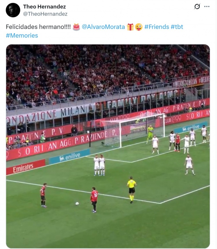 足球比分网10月23日讯 特奥更新社媒动态,祝莫拉塔33岁生日快乐。 特奥社媒晒出效力米兰期间助攻莫拉塔头球破门的视频,配文:“生日快乐,兄弟!”...