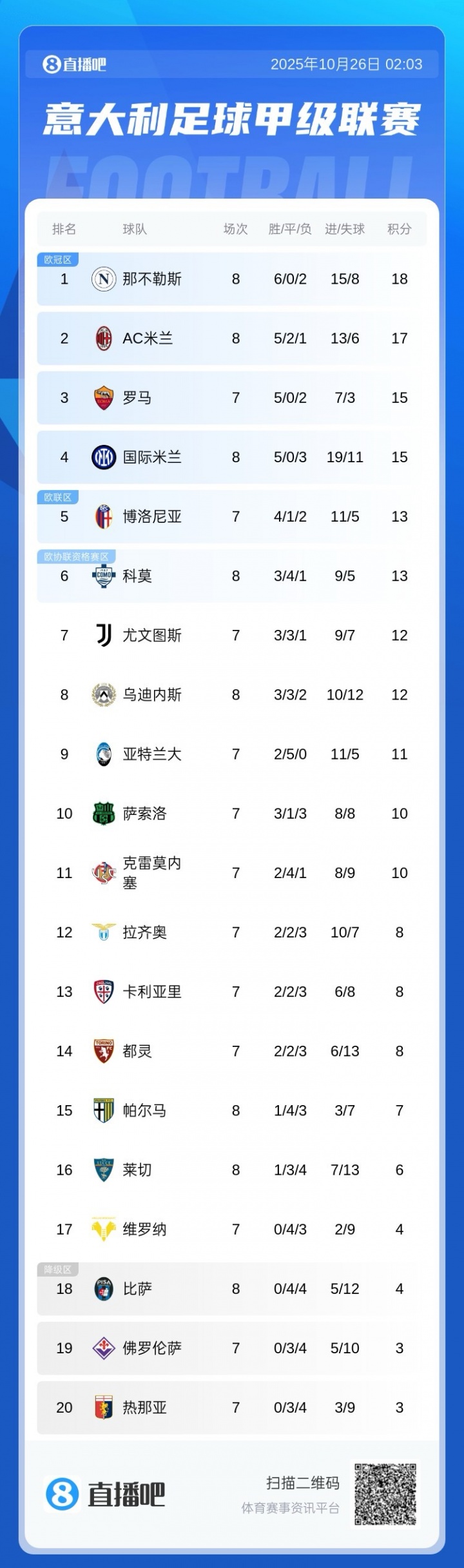 足球比分网10月26日讯 本轮意甲,那不勒斯3-1击国米,最新积分榜情况如上图。 那不勒斯目前1分优势领跑,米兰第二,本轮未赛的罗马第3,国米第4,未赛的博洛尼亚第五。 未赛的罗马...